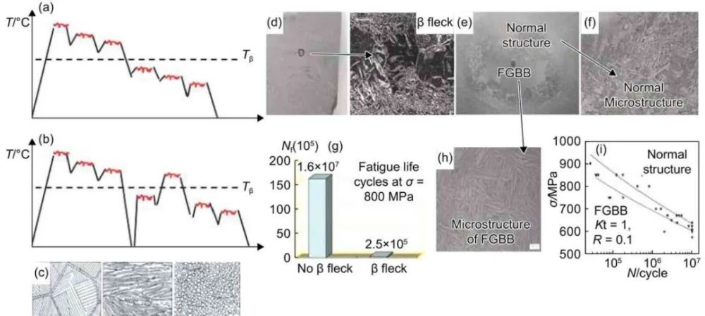 Iso-axis organization is suitable for bars, plates, wire and pipe and other semi-finished products, need to control the uniformization of ingot melting ingredients, open blank forging homogenization, nascent α phase balling, metallurgy and deformation defects and other technical key, to avoid β spots (Cr, Fe, Mo and other partial analysis) and low-fold uneven (fine crystal bright belt) tissue defects. As shown in Figure 2, when β spots appear in titanium alloy, its plasticity and fatigue performance will be greatly reduced, and when there is a low-fold uneven organization, its strength, plasticity and fatigue performance will also be reduced to a certain extent.
