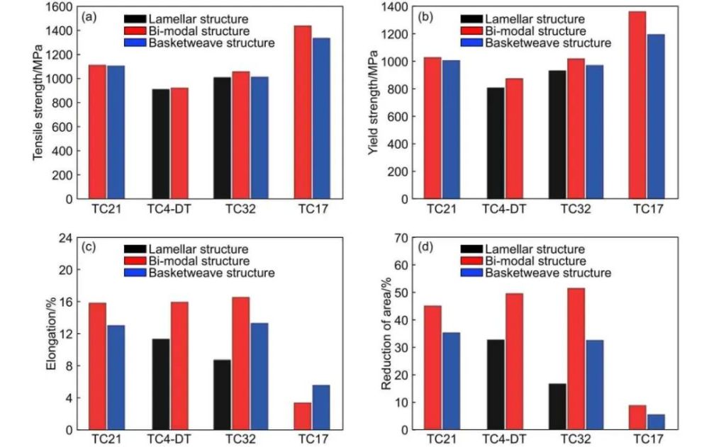 Figure 6 to Figure 8 is the relationship between the different microstructure types and room temperature mechanics of several commonly used aircraft structures, such as medium-strength and high-tough TC4-DT titanium alloy, high-strength and high-tough TC21 titanium alloy, medium-high-strength and high-tough TB17 titanium alloy, and so on.