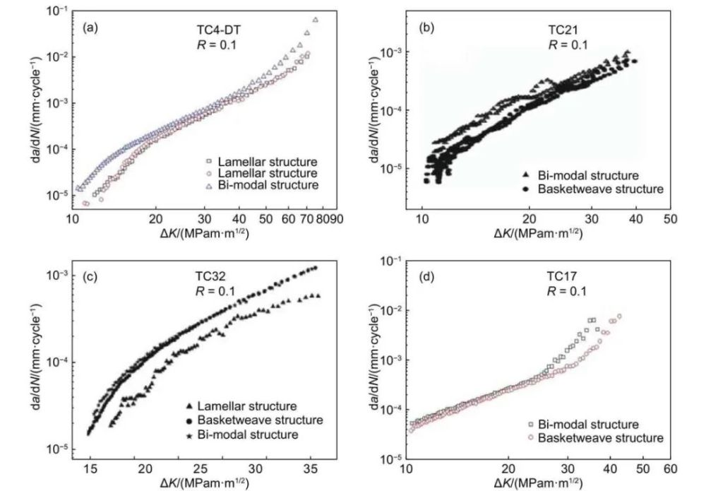 It can be seen that the two-state tissue of titanium alloy has the highest tensile strength and the best stretch plasticity, for example, the cross-sectional shrinkage rate of TC32 and TC4-DT titanium alloy is as high as nearly 50%, which fully shows the comprehensive advantages of the two-state tissue in static stretching performance (Figure 6 (d)). The quasi-β heat-treated plate tissue, which greatly improves the KIC value of fracture toughness (Figure 7 (a)) and reduces the fatigue crack expansion da/dN value (Figure 8) under the premise that the tensile performance meets the requirements for use. Although the TC21 titanium alloy bimorphic tissue is better in tensile strength and plasticity, but after the quasi-β forging to obtain the net basket tissue, it can also achieve the highest KIC value and the lowest da/dN value, to ensure that the damage tolerance design of the flying mechanism parts is required. In order to further improve the fatigue resistance of damage tolerance titanium alloy, TC32 titanium alloy obtained the best comprehensive match of two-state tissue, net basket organization and chip tissue state strength, plastic toughness, fatigue, etc., using TC32 titanium alloy trial large beam forging The gap fatigue limit of the piece at Kt s 3 can even be matched with the ultra-high strength TB17 titanium alloy medium-sized forging with a strength of 1350 MPa, showing the comprehensive toughness matching ability of this type of alloy (Figure 7 (b)). It can be further seen from the different tissue types shown in Figure 8 that the da/dN value of medium and high strength TC4-DT or TC32 titanium alloy can be the lowest when using layer tissue, and the da/dN value of high-strength TC21 or TB17 titanium alloy can be the lowest when net tissue is used. This also shows that, with the right tissue parameter control technology, different types of titanium alloys can obtain the right damage tolerance, fatigue resistance and other comprehensive performance, and better meet the aircraft structure for long life, high weight loss and low cost design requirements.